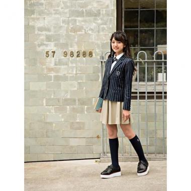 落ち着いた色合いのストライプ柄生地仕立てで、キリッと決まるジャケットです。胸ポケットの刺しゅうや、エンブレムマーク入りのボタンがプレッピームードを盛り上げるポイント♪ 卒服としてもぴったりなアイテムです。※インナーとボトムスは参考商品です・モデルサイズ153cm・着用サイズ150cm