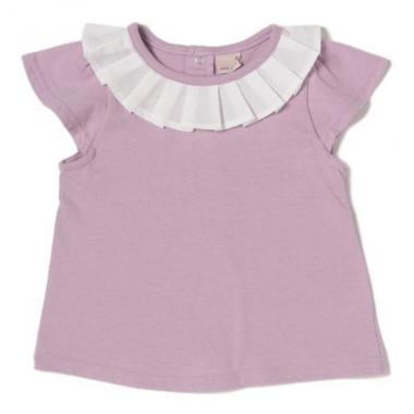 透け感あるボックスプリーツの衿が顔まわりを華やかに演出するTシャツです。袖口は広く開いたフレアスリーブでデザインし、女の子らしいエアリーな雰囲気を感じます。柄のないプレーンなルックスは、スタイリングにも取り入れやすいアイテムです。