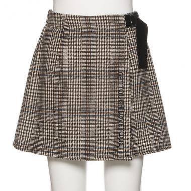 あたたかみのあるシャギーチェックのスカパンです。サイドベルトつきのラップデザインで、こなれた雰囲気を演出。フロントに縦書きロゴの刺しゅうをほどこしてキャッチーなアクセントもプラスしました。ミニ丈ながらもパンツタイプなので安心して着用できます。