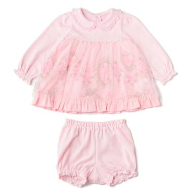 ラメ入りの刺しゅうをほどこしたチュールがエレガントな雰囲気をただよわせるTシャツとブルマのセットです。チュール裾部分にはロゴをデザインし、ブランドアピールも抜かりありません。これだけでお出かけコーデが完成するユースフルなアイテムです。