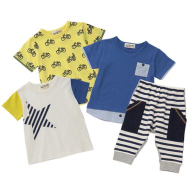 個性的な柄のTシャツ3枚とミニ裏毛7分丈パンツを合わせたBOYS4点セットです。ストライプスターTシャツと自転車総柄Tシャツは、着るだけで気分が上がるポップなデザイン。シャツレイヤード風Tシャツは、まるでコーディネートしたようなおしゃれなルックスと、イカリマークのボタンが特徴です。前後で表情の異なる7分丈パンツを合わせれば、簡単にユニークなスタイリングが決まります。ウエストゴム仕様。