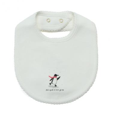 手描きイラスト風のペンギンがフロントでキュートな存在感を放つビブ。アウトラインに沿ったピコレースで繊細な表情をさりげなくのぞかせます。やさしい肌触りのコットン素材を使用。ボウをセッティングした首周りはスナップボタンで2段階まで調節可能です。