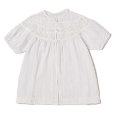 肌触りのよいコットン素材でやわらかくナチュラルな雰囲気を持つガーゼブラウスです。ヨーク部分に半円を描くように入ったラッセルレースはとても繊細なデザイン。全体に透け感を持っているので、軽やかに着こなせてインナー選びの楽しみも♪ パール調のボタンを開けて羽織りとしても活躍します。・モデルサイズ117cm・着用サイズ120cm