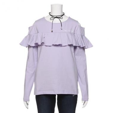 ガーリーモードを引き立てるフリルTシャツです。胸元にあしらったブランドロゴでさり気なくアピール。レザー調のチョーカーつきでニュアンスの変化も楽しめます♪ ラベンダーは無地、黒はボーダー柄です。※ボトムスは参考商品です