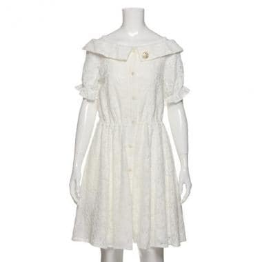 レース仕立ての華やかなワンピースです。衿つきのオフショルダーデザインで、女の子らしく上品に決まるアイテム♪ ストーンつきのモチーフが動くたびキラリと主張し、スタイルを印象的に演出します。肩ストラップは取り外し可能。両側ポケットつき。
