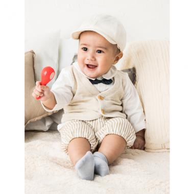 特別なシーンにおすすめしたいベスト重ね着風裏毛カバーオールです。衿やリボンタイつきのおめかししたデザインで一枚でおしゃれさんに♪ キルティングのようなふんわりやわらかな肌触りなのも特徴です。股部分の留め方で着方に変化をつけられる2WAY仕様になっています。