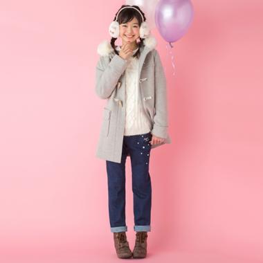 ウール素材があたたかでやさしい雰囲気を演出するロングダッフルコートです。上部のトグル付近にのみリボンモチーフを添えた、可愛らしいディテールがポイント♪ フラップはフェイクになっており、サッとものを入れられる仕様のポケットです。フードのフェイクファーはつけ外しができます。※ボトムスは参考商品です