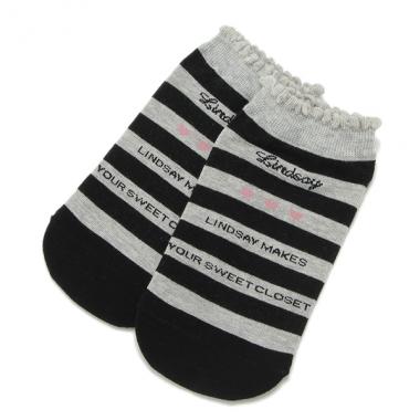 カジュアルなボーダー柄のスニーカーインソックスです。ボーダーにメッセージ性のあるロゴをサンドしてアクセントを効かせました。はき口にはポコポコとしたフォルムが愛らしいフリルをつけてキュートさをプラス♪ デイリーに取り入れやすい一足です。