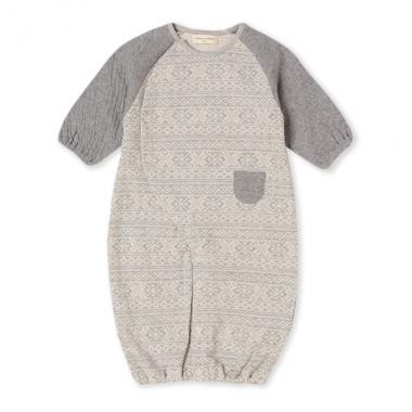 袖をワンカラーで切り替えたスノー柄のカバーオールです。股部分のスナップの留め方を変えると、パンツルックにもなる2WAYタイプ♪ 小さなポケットをワンポイントにあしらいました。裏毛仕様でさらりとした着心地です。
