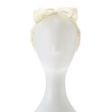 しっかりとした風合いでリボンが愛らしいヘアバンドです。後頭部をゴムでくしゅっと寄せて、ニュアンスに変化をプラス。ラメ入りのブランドロゴ刺しゅうもポイントです。正面、サイドとリボンの位置を変えてアレンジできます。
