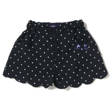 さりげなくつけたポケットのネコ耳に遊び心を感じるショートパンツです。小さめの総柄ドットが主張しすぎずおしゃれ♪ 裾にはスカラップ、フロントにはリボンフォルムをかたどって愛らしいディテールをちりばめました。ウエストはアジャスターゴムで調節可能です。
