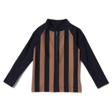 身頃に柄生地を用いた、存在感のあるラッシュガードです。全体を落ち着いたトーンでまとめて大人っぽい仕上がりに♪ バックの裾に掲げたロゴも目を引くポイント。カーキはドット柄、紺はストライプ柄と、カラーによって異なるパターンを採用しました。・モデルサイズ113cm・着用サイズ110cm