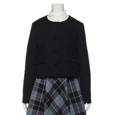 ネックまわりをすっきりと見せてくれるノーカラージャケットです。リボンフォルムのポケットでキュートなエッセンスをプラスしました。スタンドカラーやフリル衿などをチラ見せする着こなしがおすすめ。コンパクトに収まるショート丈はスタイリングのバランスが取りやすく便利です。※インナーとボトムスは参考商品です