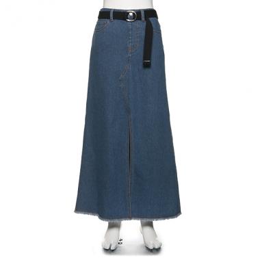 ちょっぴりレトロな雰囲気ただようデニムロングスカートです。フロントへ長めに入れたスリットが足さばきをよくするポイント♪ デイリー使いにも気兼ねなくお使いいただけます。シンプルなベルトはお好みでつけ外しが可能です。