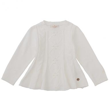 ケーブル編みデザインで表情豊かに仕上げたセーターです。ふわっと広がるフレアラインがフェミニンなポイント。裾にはブランドロゴ入りのスペード型プレートをあしらいました。ふんわりソフトな肌触りで快適な着心地のアイテムです。