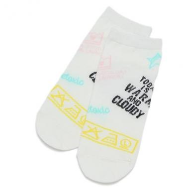 ランダムにデザインしたロゴや、洗濯表示風のマークが遊び心を感じさせるソックスです。模様の一部にラメをミックスし、繊細なきらめきをプラスしたアイテム♪ ブランドらしい個性の光るルックスで、コーデのアクセントとして活躍します。