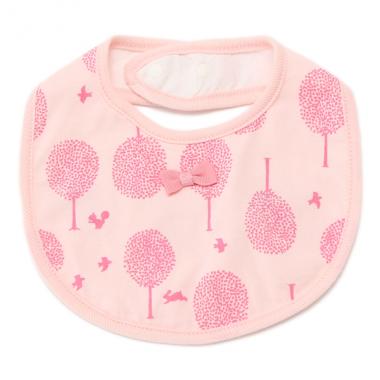 繊細なタッチの木や動物のシルエットがノスタルジックなムードをただよわせる総柄スタイです。本体中央へ小ぶりのリボンをあしらい、愛らしい仕上がりに♪ コットン素材の編地を採用しており、使い心地も良好です。首周りは2段階までサイズ調節ができます。