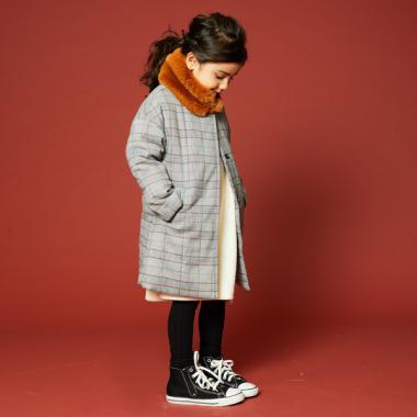 ノーカラーのシンプルなデザインで、大人っぽく着こなせるコートです。フェイクファーのティペットがついた、リッチ感ただようアイテム♪ ベージュ・チャコールは無地、グレーはチェック柄と、カラーによって異なるパターンを採用しました。