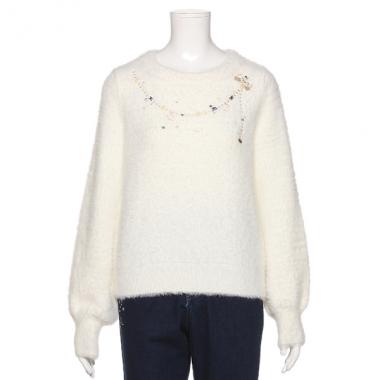 リッチな存在感たっぷりの風合いが魅力のシャギーニットです。ネックまわりには刺しゅうやフェイクパールなどでネックレスを表現した手の込んだディテール♪ 袖先に向かってボリュームを持たせ、女の子らしいフォルムを意識しました。※ボトムは参考商品です