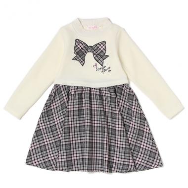 リボンアップリケつきのガーリーなワンピースです。スカート部分をチェック柄で切り替え、コーディネート風に仕上げたアイテム♪ ネックの開きを控えめにデザインしており、品良く着こなせます。両側ポケットつき。