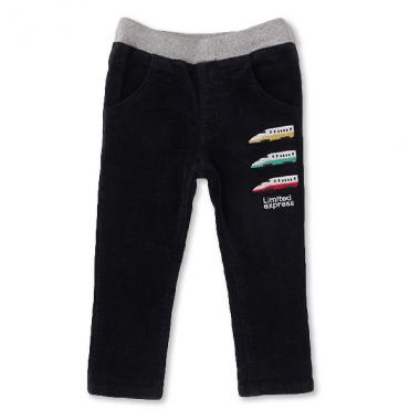 3台の電車刺しゅうをほどこし、カッコいいアクセントを加えた九分丈ストレートパンツです。本体はコーデュロイ生地を採用し、あたたかな雰囲気に仕上げました。ウエストはアジャスターゴムでサイズ調整が可能。細身シルエットですっきりと着こなせます。