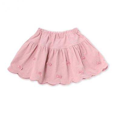 細かいうねのコーデュロイ生地にミニリボンをトッピングした、ガーリームードただようスカートです。ギャザー入りのふんわりとしたシルエットや、スカラップ形の裾も女の子らしさあふれる仕上がり♪ ウエストはアジャスターゴムで程良いサイズ感に調節できます。右側ポケットつきです。