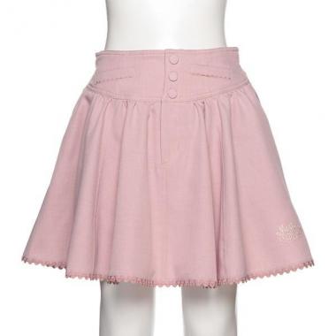 フレアシルエットで女の子らしいスタイリングを叶えるスカパンです。ヨークにくるみボタンを添えて、ちょっぴり大人っぽい雰囲気に。スナップで簡単に着脱できます。両側にポケットつき。ピンクは無地、紺はボーダーとカラーによってパターンが異なります。ウエストはアジャスターゴムでサイズ調整が可能です。