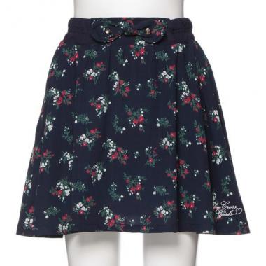 上品な花柄をプリントしたスカパンです。取り外し可能なリボンモチーフをワンポイントにプラスしました。裾にはロゴ刺しゅうを添えてさり気ないアピールに♪ 裏地がパンツになっているので、アクティブに動けます。右側ポケットつき。ウエストはアジャスターゴムでサイズ調整できます。