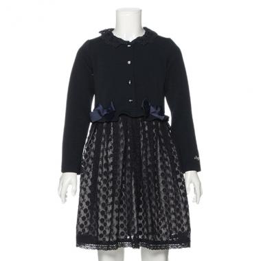コンパクトなジャケットとスカートをコーディネートしたようなドッキングワンピースです。ジャケット部分はきちんとフォルムながらもレース衿やリボンでキュートな味つけ。透け素材にお花柄刺しゅうをオンしたスカートは軽やかさを演出します。ディテールに凝りつつ落ち着いたカラーでまとめ、大人っぽい雰囲気で着こなせるアイテムです。