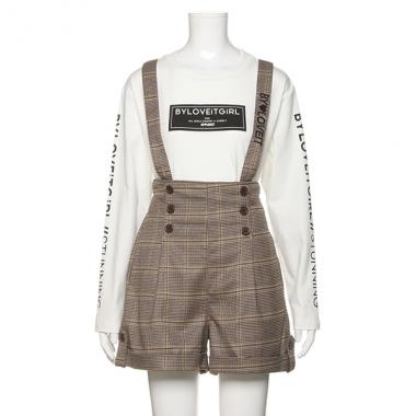 ハイウエスト×ダブルのボタン飾りがクラシックムードを盛り上げるチェック柄ショートパンツです。目を引くロゴ入りのサスペンダーは、お好みで取り外せる仕様♪ 品のあるルックスで、カジュアルにもキレイめにも着回せます。両側ポケットつきです。※インナーは参考商品です