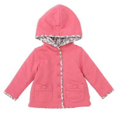 ボウをあしらったポケットがキュートなポイントのフードつきジャケットです。表側はシンプルな無地のデザイン、裏側は華やかなフラワー柄のデザインと気分で裏表のデザインを選べるリバーシブル仕様のアイテム。中わた入りのあたたかな着心地もうれしいポイントです。