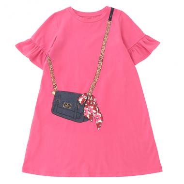 まるでスカーフつきバッグを肩にかけているような、ユニークなトロンプルイユデザインのドレス。グリッターのプリントが華やかな印象です。袖はフリルに仕上げて、キュートなアクセントを効かせました。裾にかけてゆったりと広がるAラインもポイント。やさしい肌触りの生地で、着心地も抜群です。