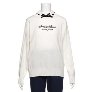 モックネックでさりげなく首元を印象づけるニットです。スカラップカットにリボンを通した衿デザインでさらにキュートさもトッピング♪ ニットでありながらも薄手なのでアウターインにするのも問題なし。タックインしてフレアスカートとのコーデするのもおしゃれです。※ボトムは参考商品です