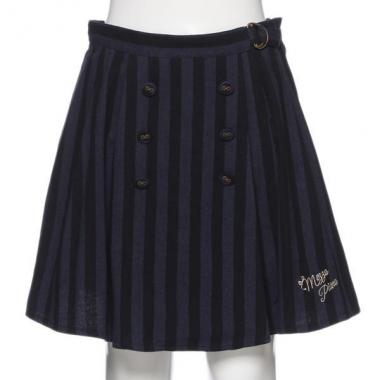 スカートをはいているかのようなデザインがポイントのスカンツです。フロントにボタンをほどこし、アクセントをつけました。ブルーグリーンは無地、紺はストライプで仕上げた、カラーによって異なるパターンを採用。アジャスターゴムがついているので、簡単にサイズ調節できます。右側にポケットつき。