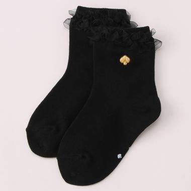 ゴールドのモチーフアイコンがさりげなく気品を放つソックス。はき口には控えめでありながらも存在感あるオーガンジー素材を使用。ふんわりエアリーな女の子らしい見た目は足元に華やかさをプラスしてくれます。シックなカラーリングなのでフォーマルなシーンにも着用いただけます。