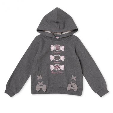 チュールやストーンなどをミックスしたキャンディモチーフがスウィートに映える裏毛パーカーです。裾サイドへレースアップをほどこして、女の子らしいアクセントを効かせたアイテム♪ フード部分を取り外してイメージチェンジできるのもポイントです。