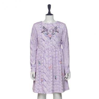 ケーブル柄ニットのリアルな転写デザインが遊び心を感じさせる裏毛ワンピースです。お花やリボンをミックスしたスウィートな模様がポイント♪ ウエストからふんわりと広がるシルエットで、女の子らしく着こなせます。