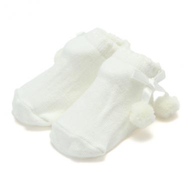 歩くたびに揺れるポンポンで赤ちゃんのキュートさをより引き立てるソックス。落ち着いたカラーリングながらもボウとポンポンの華やかなディテールで目を引く印象的なデザインに。はき口部分を少しぷっくりとしたフォルムで絞りを入れフィット感を高めました。足裏にはすべり止めプリントをほどこしています。