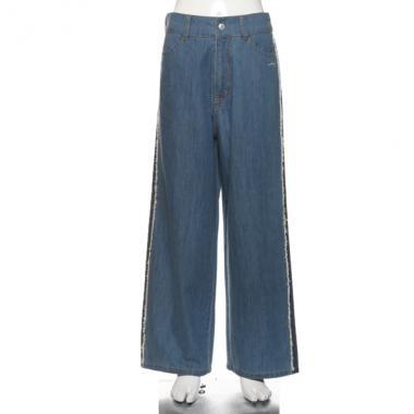 サイドの切り替えでフリンジ状のアクセントを効かせた、リメイク風デザインのデニムパンツです。存在感あふれるワイドシルエットで、コーディネートの主役として活躍するアイテム♪ ウエストはアジャスターゴムで程良いサイズ感に調節できます。