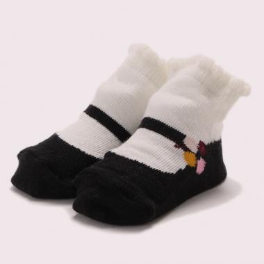 シューズを脱いでもおすましスタイルをキープしてくれるソックス。四つ葉のクローバーのようなモチーフをサイドにあしらったバレエシューズデザイン。はき口にはふわふわフリルで女の子らしいやわらかい印象をプラスしました。