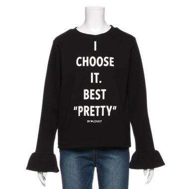 ダブルフェイスの生地を使った、しっかりとしていて着やすいTシャツです。カジュアルなメッセージプリントのデザインを、袖口のフリルでガーリーに味付け! デニムパンツはもちろん、スカートとのコーディネートにも活躍します。※ボトムスは参考商品です
