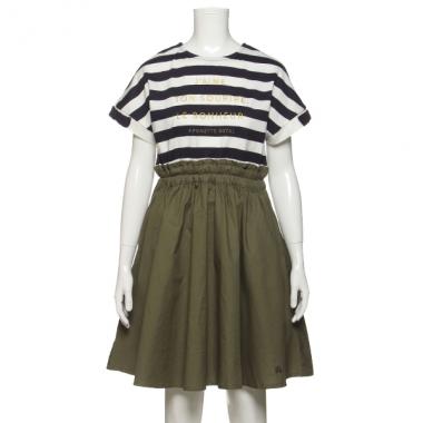 一枚でレイヤード風に見えるおしゃれワンピースです。カジュアルの定番、ボーダーを採用し着こなしやすいデザイン♪ フロントのロゴでアクセントをプラスしました。ウエストはアジャスターゴムで調節できる仕様。両側には便利なポケットつきです。※トドラーサイズあり、品番:4882318