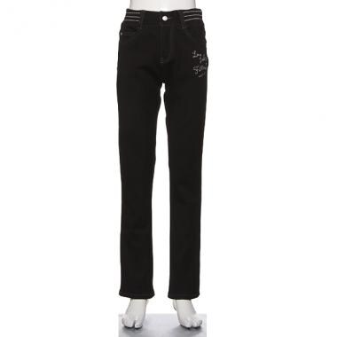 すらっとしたルックスで脚長効果も期待できるデニムスリムパンツです。ウエストにはラメ入りのラインをデザインし、細かなところにもこだわりました。ポケット口に配したリボンもチャーミング♪ ウエストはアジャスターゴムでサイズ調整が可能です。