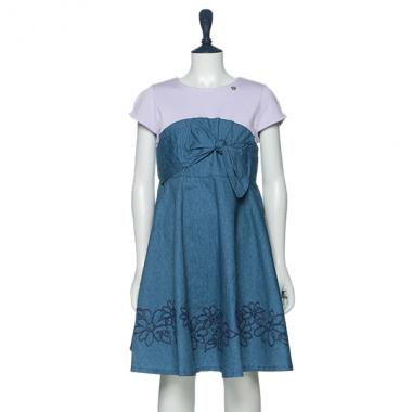 身頃部分をキュッと締めたメリハリあるシルエットが印象的なワンピースです。カジュアルなルックスのデニム地で切り替えた普段使いにもなじむ一品。きらめくお花刺しゅうや胸元の大きなリボンも可愛らしいポイントです。両側にはポケットがついています。