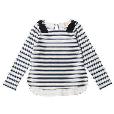 肩にボウのテープをあしらったストライプ柄トップス。カジュアルなデザインに女の子らしさを加えた一着です。後ろ下がりのラウンドヘムもさりげないポイント。肌当たりのやさしいソフトな生地で、着心地良好です。バックネックは涙開き。